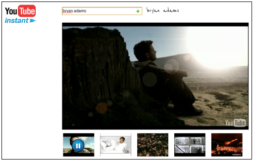 I have been invistigating its features and found it extremely user friendly. It is totally differnt from YouTube. The homepage is pretty simple and it has nothing but a search box where you can type your query.. When you type in a search term , YouTube Instant pulls in the most popular YouTube video for that word and starts playing it immediately. It also shows the next 5 videos just below the one which is playing.